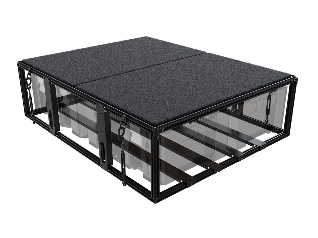 This storage system includes 1 storage unit, top deck, brackets, all necessary installation hardware and detailed fitment instructions. Front Runner Wolf Pack Pros, the heart of this modular storage system, are perfectly sized for kitchen supplies, dried goods, tools, camera gear, toiletries, even clothes. These clip-to-close, stackable and durable SBOX031 storage containers are made from black, high strength plastic and have integrated grips for easy carrying. Insert SBOX027 in the SBOX031 or SBOX052 to further protect camera gear, kitchenware and other fragile items. (Front Runner Flat Packs and Storage Box Foam Dividers sold separately). Slide your SBOX031 in the storage system for easy, rattle-free storage. This storage system is spring-loaded to secure your SBOX031 in place, preventing vibration and excess movement. 80kg / 176.4 lbs top deck load carrying capacity, can also be used to mount Front Runner Cargo / Fridge Slides. The deck is covered with a durable, UV resistant nylon pile carpet. Finished with the same durable black powder coating as Front Runner Roof Racks and other Front Runner products. This Front Runner Storage System can be easily installed in minutes by attaching the supplied C-hooks and turnbuckles to the vehicle’s existing mounting points. Removing the storage system is just as easy. This storage system is designed for interior use or in a Pick-Up load bed with a canopy, camper shell, or other style bed / load bed cover. All Front Runner Storage Systems are backed by a 2 year warranty. If you have any questions about whether or not this product will fit your vehicle, please contact Front Runner before purchase.